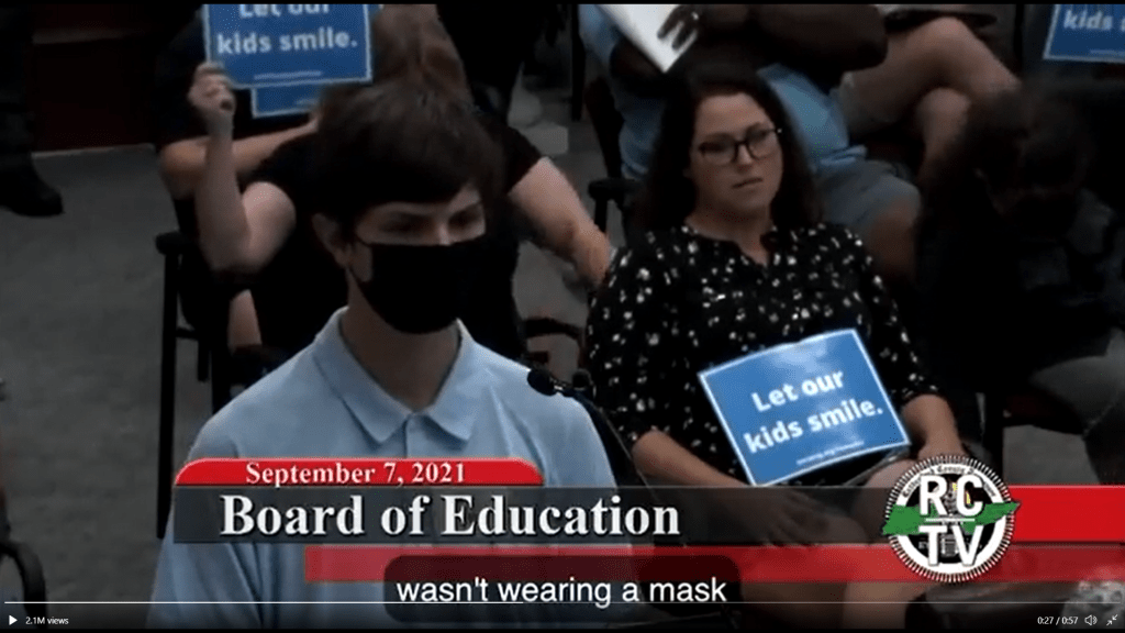 On this video, Casher can be seen sitting next to a friend – sans masks – and holding a “Let Our Kids Smile” sign as a 17-year-old high school student – who is wearing a mask – addresses the members of the local board of education about how his grandmother died of COVID-19 and why he wears a mask…to prevent the spread of the coronavirus.