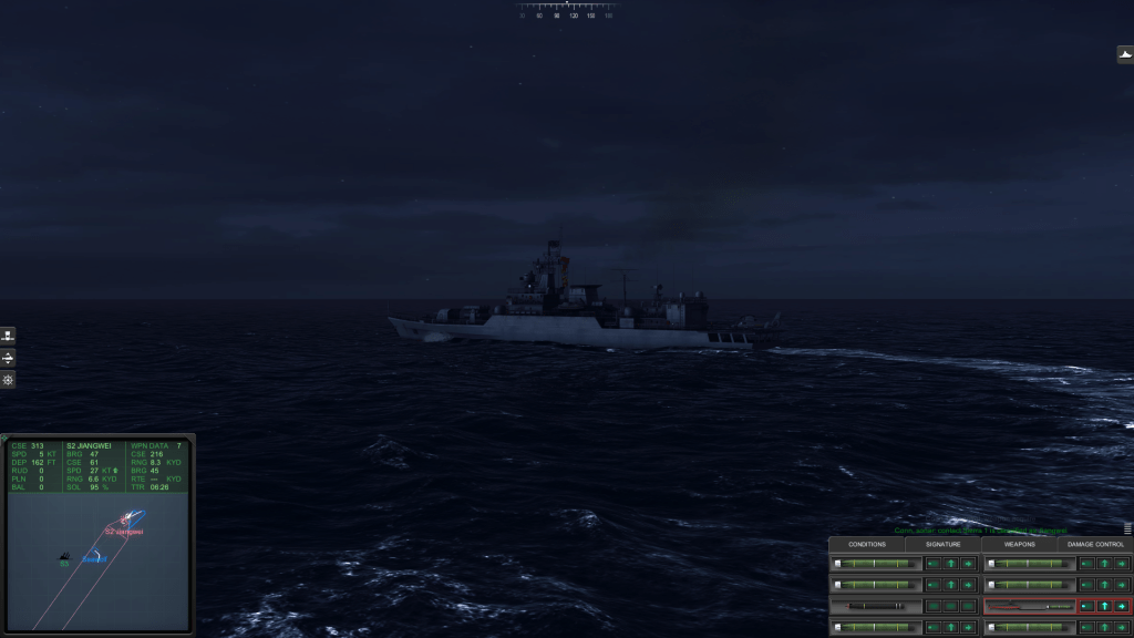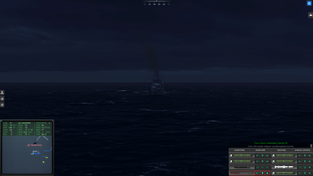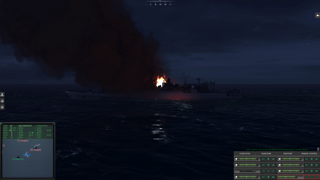 I have played Junks on Parade several times since I bought Cold Waters in July of 2020, and in all those sessions, I’ve only come out of the fight unscathed once. Otherwise, the best that I’ve managed to do is to sustain “only” one hit from enemy weapons; usually, I get hit by at least two air-launched weapons, which due to their smaller size don’t do as much damage to my Seawolf as the heavier wire-guided torpedoes from the Jiangweis, Chengdus, Ludas, and Sovremennys that escort the amphibious and cargo ships in this scenario.