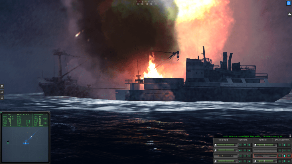 A Luda-class frigate goes up in flames after a hit from a Mk. 48 torpedo. (C) 2017 Killerfish Games