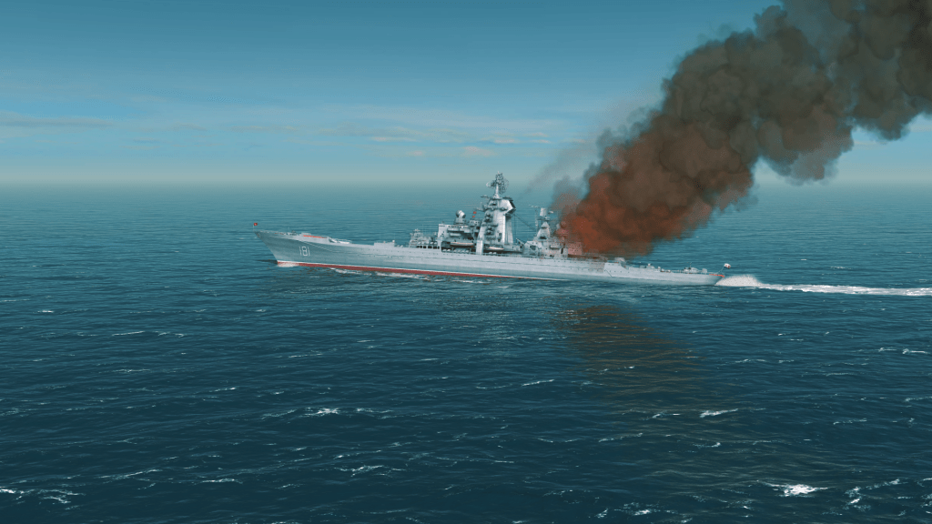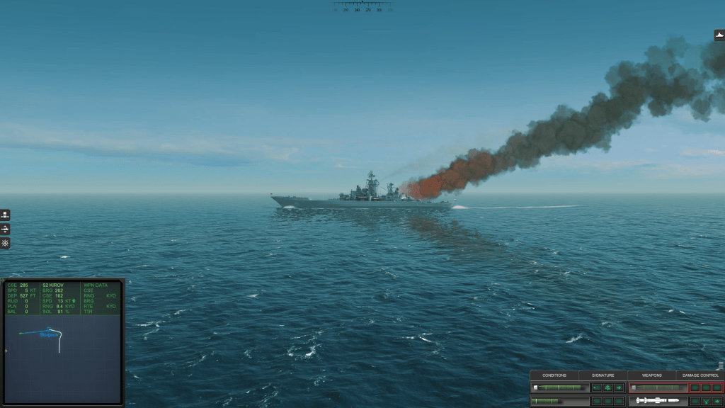 As I recall, I used my wire-guided torpedoes to damage Kirov – one ran out of fuel before it could hit the Soviet battlecruiser, but the second torpedo struck home and damaged Kirov so badly that she was afire and limped along at 12 knots, far less than her max speed of 32 knots. With the main target burning and seriously damaged, I focused my energies on sinking the escorts while avoiding sonobuoys and air-dropped torpedoes from the Il-38 May orbiting overhead.