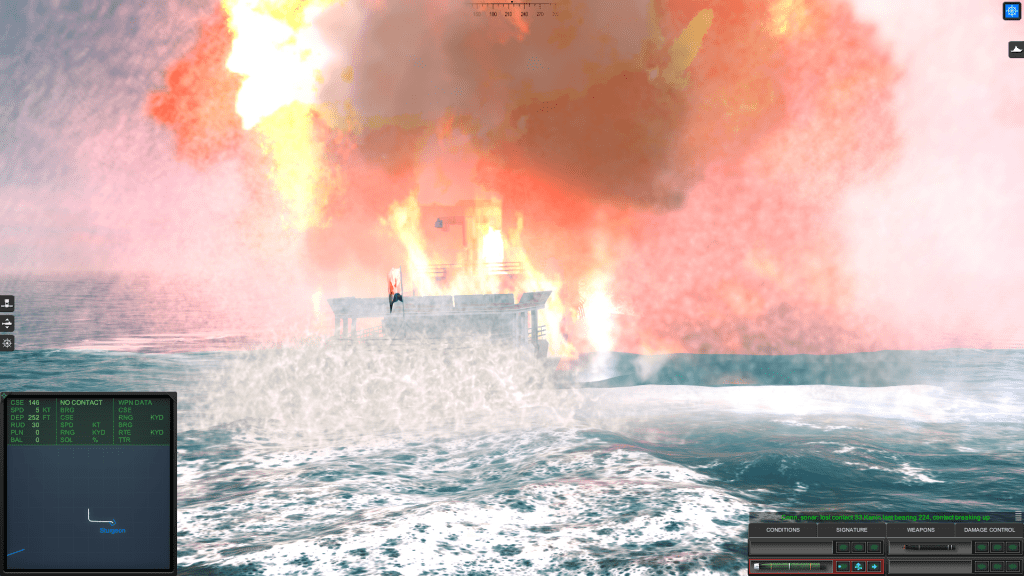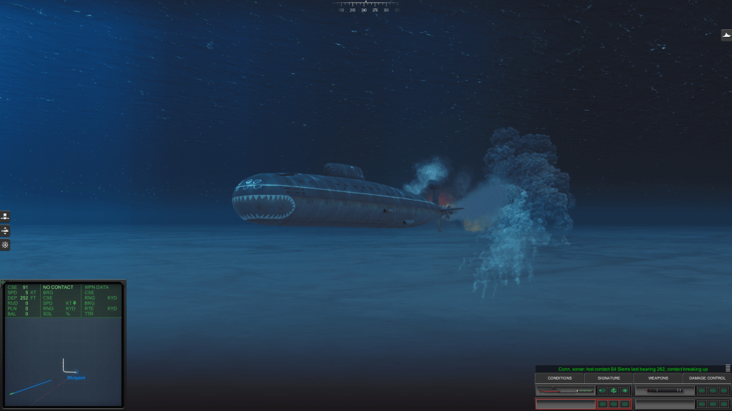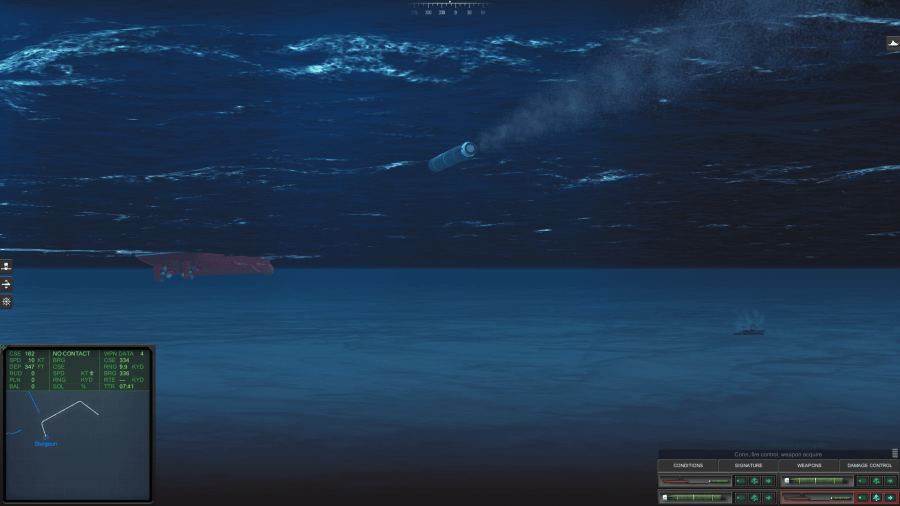 The first mode – Training – teaches you the basics of sub warfare: how to fire unguided torpedoes, wire-guided torpedoes, using sensors, diving and maneuvering your boat, damage control, firing missiles, and navigation.