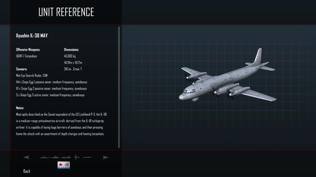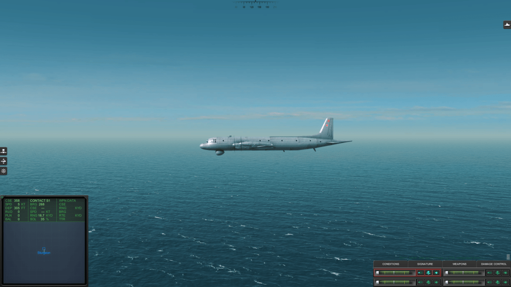 And, as I said earlier, Cold Waters will randomize the mix of enemies you face. The number of surface ships in the Kirov battle group is fixed at three, but the class types of escorts vary. And sometimes the surface ships have a friendly sub with them, sometimes they don’t. Always, however, the Il-38 May is there to provide air cover and dissuade NATO subs from using long-range ASMs like the UGM-Harpoon.