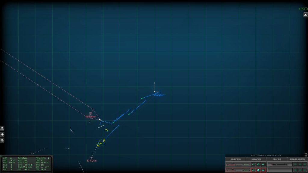 See, even though your boat has four torpedo tubes and can fire Mk.48 ADCAP (advanced capability) torpedoes and UGM-84 Harpoon anti-ship missiles (ASMs), you can only fire two wire-guided torpedoes at one time. If you fire four Mk.48s at the three warships (two at Kirov, one each at the escorts), you can guide only two of them. The other two “fish” have to be carefully aimed at an interception point (IP) based on your best guess. Those unguided torpedoes will run straight till they reach their activation point, then they’ll go “active” and search for a target until they either hit it or run out of fuel.