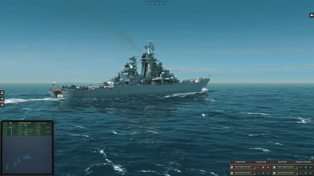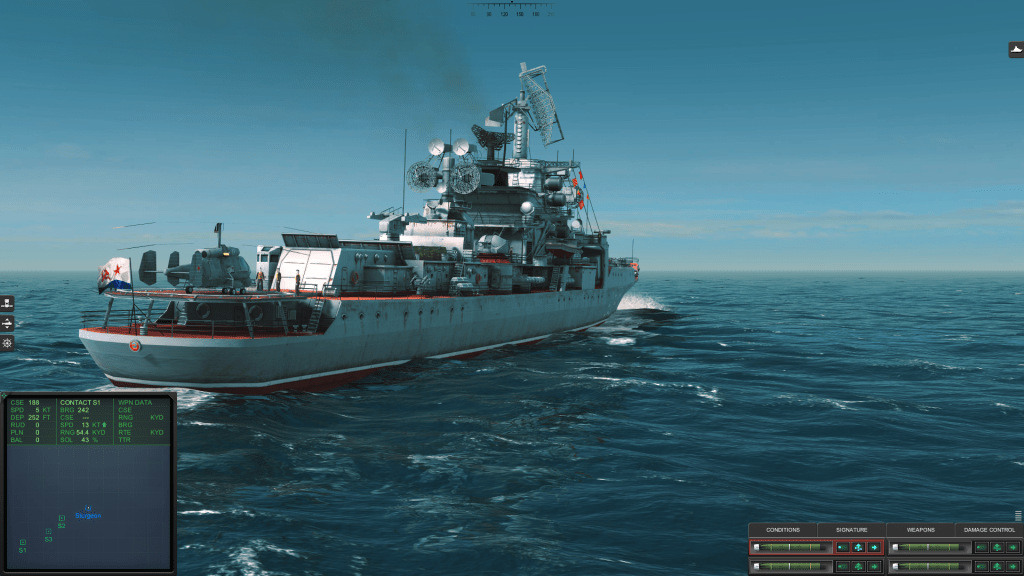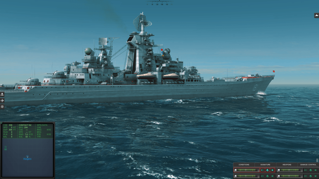 - Be stealthy. Soviet naval tech might be slightly inferior to its Western counterparts, but Russian sonar operators are well-trained and are listening for boats like yours on their echo-location equipment. Like your boat, Ivan has both active and passive sonar gear, and if you cruise along at higher speeds than 5-10 knots, chances are good that the Russians will hear you. If you are within the 10,000 yard kill zone and have a decent firing solution on at least two enemy ships – preferably the Kirov – fire four torpedoes and then rig for ultra-quiet. If you’ve done your TMA and aimed your two unguided torpedoes just right, you might get lucky and hit all three ships in the enemy surface action group while avoiding being hit yourself