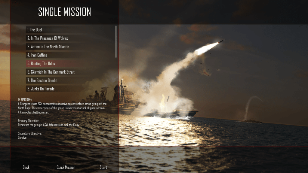 Beating the Odds is the fifth mission in the Single Missions lineup. It is set in the same period as the 1984 North Atlantic campaign with you as a U.S. Navy submarine commander in a war against the Soviet-led Warsaw Pact.