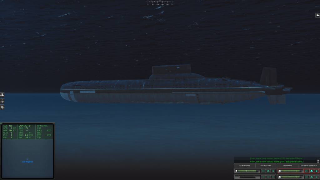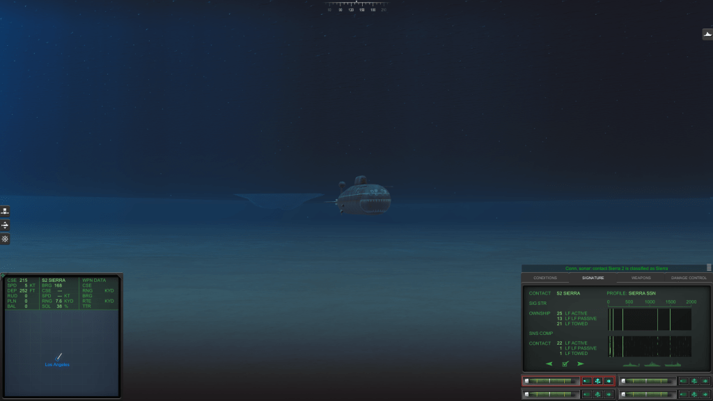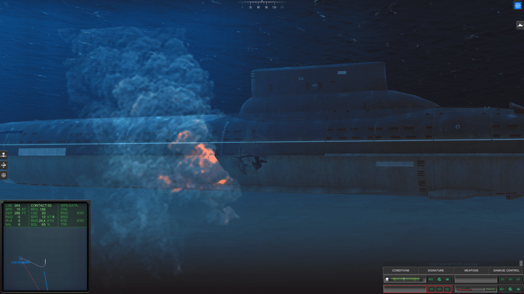 By all means, if you want to get cinematic and hit the F2 key to see what your current target looks like, go ahead. The striking visuals of Cold Waters are part of why it’s one of my all-time favorites and makes me wish someone (Ubisoft, I’m looking at you!) would upgrade a licensed-by-the-Clancy estate upgrade of Red Storm Rising. It is not a realistic way to play the game – if you want to play Cold Waters as though you were a real submariner, you’d stick to your tactical display screen and the various mini-displays for acoustic conditions, sonar signatures, weapons loadout, and damage control.