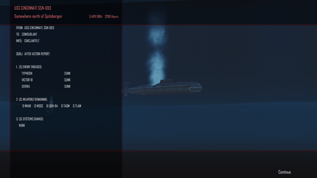 - Don’t get “target fixation” and focus only on the Typhoon. Yes, firing two torpedoes at the primary target would kill it if you made a good TMA and the torps were fired exactly right, but if you leave the enemy SSNs for “dessert,” your next of kin will be visited by a Casualty Notification Team. And that would ruin your whole day