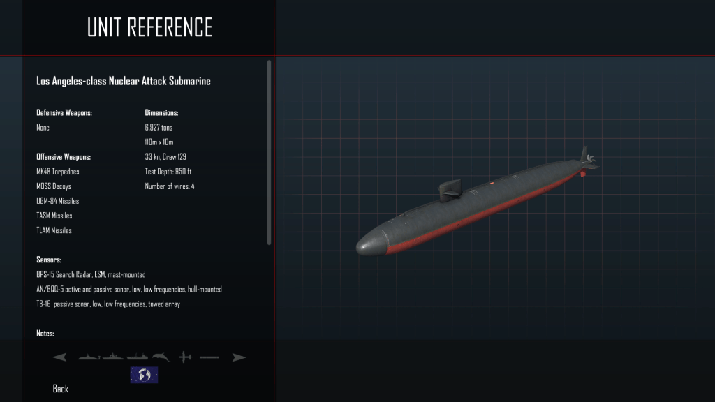 All the U.S. submarines in the 1984 scenarios have four torpedo tubes and 16 torpedoes, but not all of them can fire four wire-guided torpedoes at once. The older Skipjack and Permit classes have only one wire, while the Sturgeon and Los Angeles classes have two or four wires, respectively. So, if you are new to the game and want to survive and thrive in Stalking the Red Bear, choose the Los Angeles class boat until you are an ace in that mission.