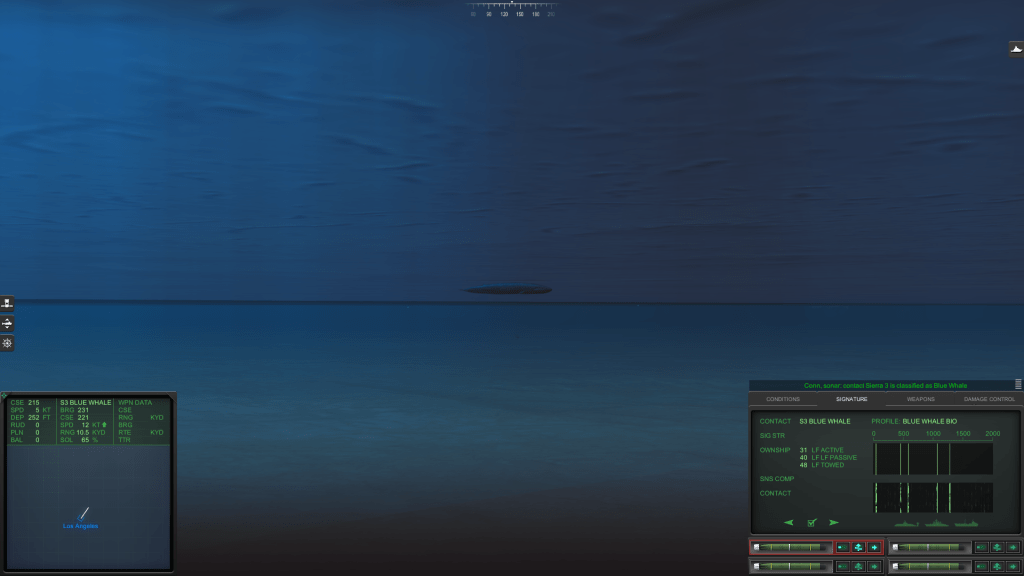 As if that wasn’t plenty to worry about already, this area is the natural habitat for “biologicals” – usually blue whales. So if your sonar operator calls out “Conn, Sonar: New contact bearing 0-2-0, designated Sierra One,” make sure you use your sonar classification feature and match the contact’s signature with those in the sonar signature database. Not only do you not want to waste a torpedo that can be better used against the enemy, but you do not want to kill a poor, innocent whale!