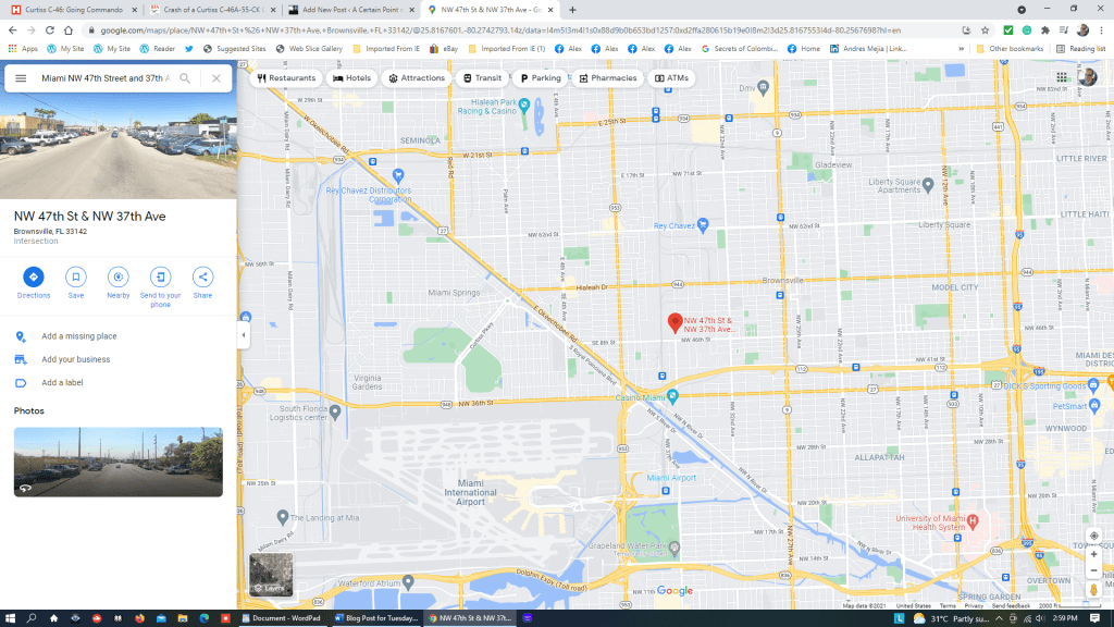 Instead, knowing that their crippled Commando was losing altitude – fast – and trailing flame and smoke from the port engine, the pilots chose to crash-land the plane at the ABC Auto Junkyard on NW 47th Street not far from NW 37th Avenue in a mostly black neighborhood called Brownsville.