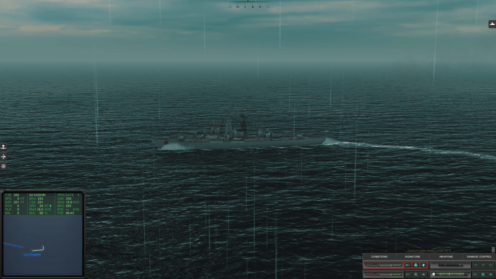 Even then, the game was not a cakewalk. One of the escorts, a Kashin, fired an ASW torpedo at me that missed me not so much because of deft maneuvering on my part, but rather because my Mk-48 ADCAP torpedo hit the destroyer first and presumably killed the weapons specialist at the controls.