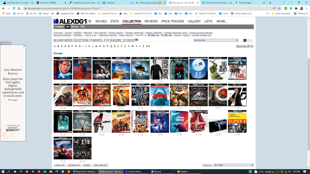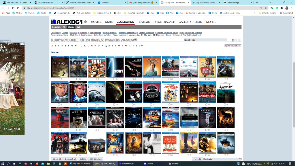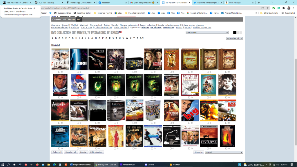 My Blu-ray collection – as of January 12, 2022 – is a combination of upgrades from DVDs – including the de rigueur Star Wars, Star Trek, and Lord of the Rings franchise titles, plus titles I bought only on Blu-ray after 2008, and 58 seasons’ worth of TV series, TV movies, and miniseries. Of the 452 Blu-ray titles in my collection, 394 titles are feature films. (Keep in mind, however, that quite a few of those titles are repeats, especially when it comes to the three Star Wars Skywalker Saga trilogies. I have back up sets for the ones I watch, and back ups for those.