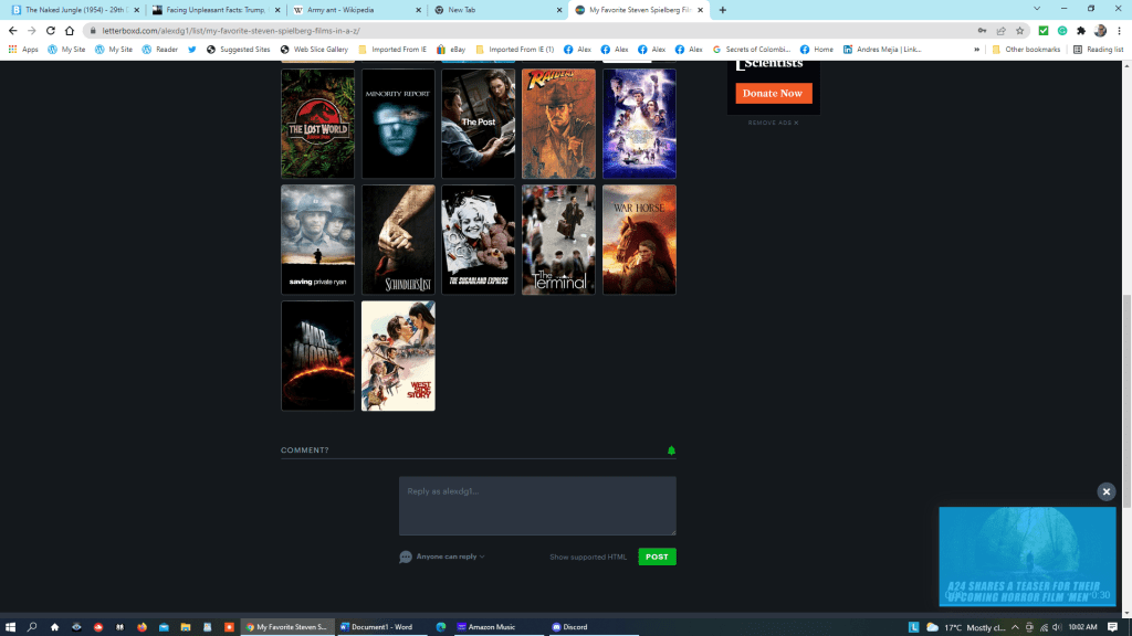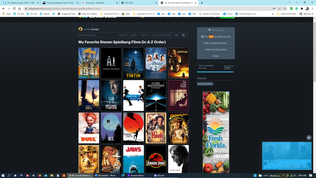 That being said, I have seen most of Spielberg’s blockbusters in theaters, including the four Indiana Jones films he directed, E.T., Hook (the only “flop” of Spielberg’s I’ve seen on the silver screen), Jurassic Park, Schindler’s List, The Lost World: Jurassic Park, Saving Private Ryan, A.I.: Artificial Intelligence, Bridge of Spies, and The Post.