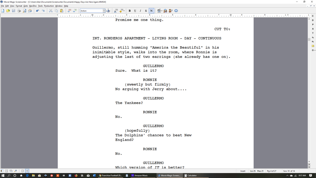 The most important item on my to-do list was to download and install my screenwriting software. I have used Movie Magic Screenwriter 6 from Write Bros. for many years – probably since 2008 or 2009, I don’t remember exactly – and I had to buy a downloadable copy with licenses for several devices last year because my Lenovo IdeaPad doesn’t have a disc drive for the Screenwriter 6 CD-ROM that I brought to Lithia from Miami six years ago. (I’m also sure that I had maxed out the license on that disc, since I used it to install the software on three computers, including the Lenovo C560 that now sits in the garage awaiting its dissection and disposal.)