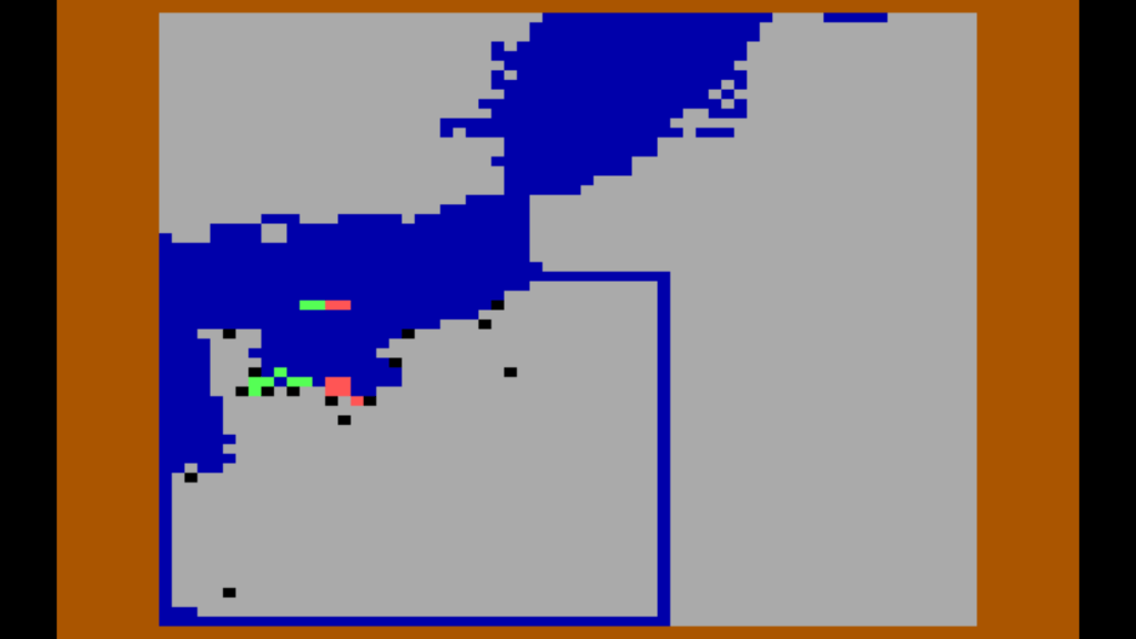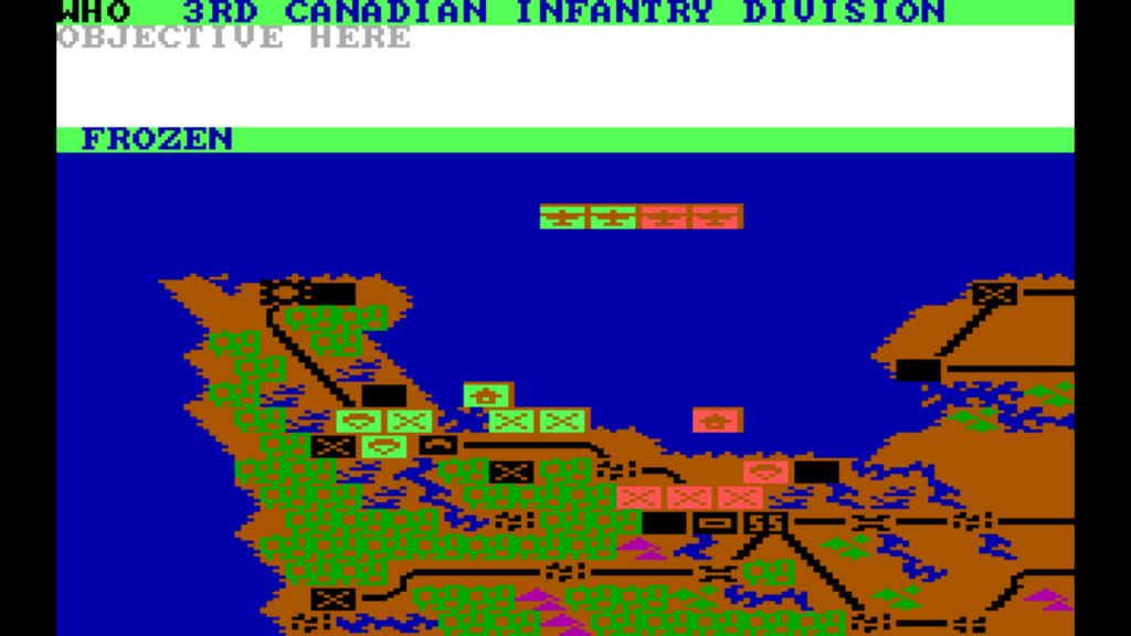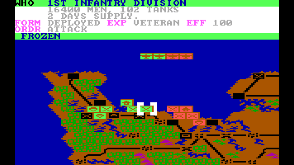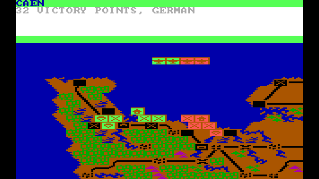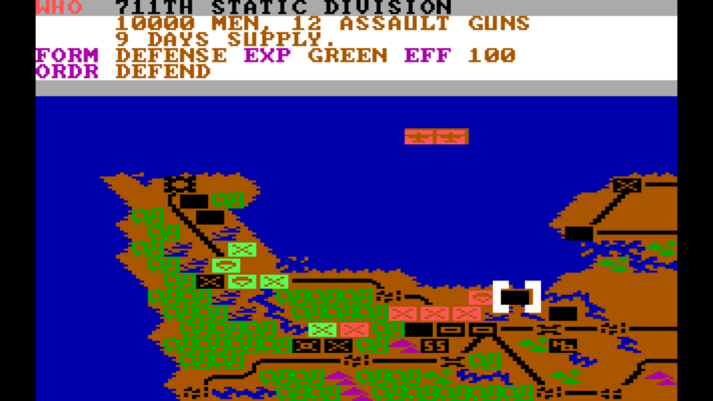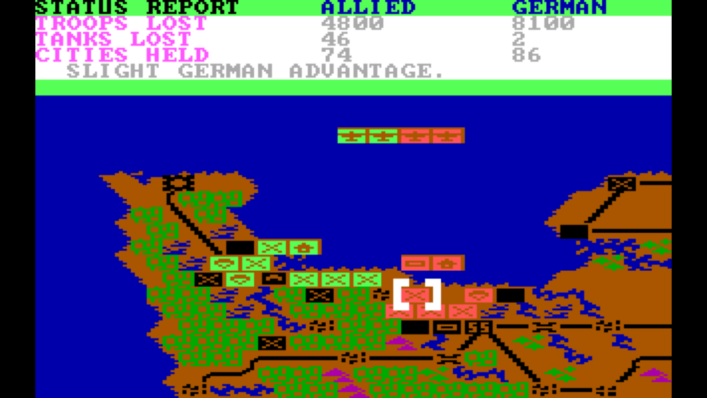 The game considers such things as weather and time of day. Of course, we don’t see the actual weather on the screen; 1980s computers – at least the ones we used at home – did not have the computing power or graphics to depict weather. But players can see the effects of weather on the conduct of battles. The attacking side – especially the Allies with their air wings – performs better on days when the weather is Clear, but combat efficiency and availability of air support deteriorates incrementally when the weather gets bad. Planes will fly less and be more inefficient in Overcast conditions, and they will not be available – at all – on days when the forecast is Rain or Snow. Bad weather favors the defense because it affects visibility on the battlefield and impedes vehicles – ground, where roads are not present, gets muddy and tanks and other vehicles can’t move easily.