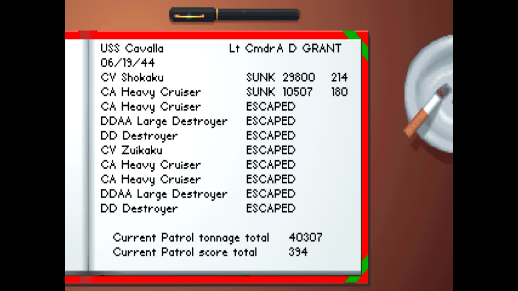 Now, now. Don’t fret. I’m not going to regale you with a long account of the battle. Suffice it to say that Silent Service II runs well on this PC and that even though my hi-scores from my previous PC did not carry over to this one, I successfully finished An Embarrassment of Riches without getting a scratch on my Gato-class boat.