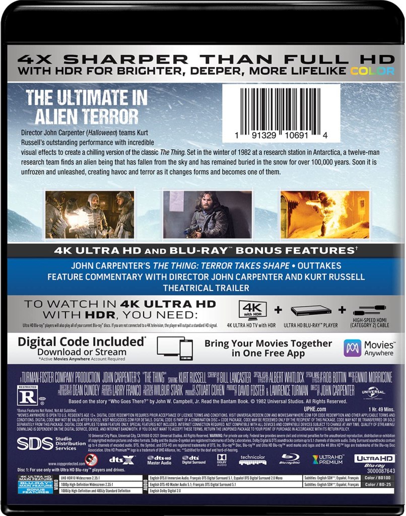 Anyway, my 4K UHD Blu-ray of John Carpenter’s The Thing (1982) arrived yesterday afternoon at 12:57 PM; I didn’t go to the front door right away, though, so I retrieved the package a couple of hours later. When I picked up the packing envelope to take it to my room I could hear the rattling of a loose disc, so I took the 4K UHD/2K Blu-ray two-disc package out of the envelope, opened the jewel case, and, sure enough, the 4K disc had come loose from its storage compartment. I pressed it back in its place, took the little slip with the digital copy code, and redeemed that in my Movies Anywhere account.