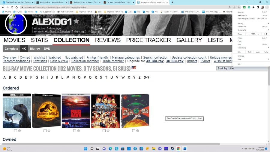 This morning I updated my Collection page in my Member profile at www.bluray.com and moved three titles – Jurassic World Dominion – Steelbook (Expanded Edition), Jurassic World: Ultimate Collection, and Red Dawn: Collector’s Edition from the Ordered section to Owned. The package with those pre-orders arrived yesterday at 3 PM, along with two bottles of Listerine Clear Mint mouthwash and a 48-count box of Quaker Instant Oatmeal that I ordered on Monday.