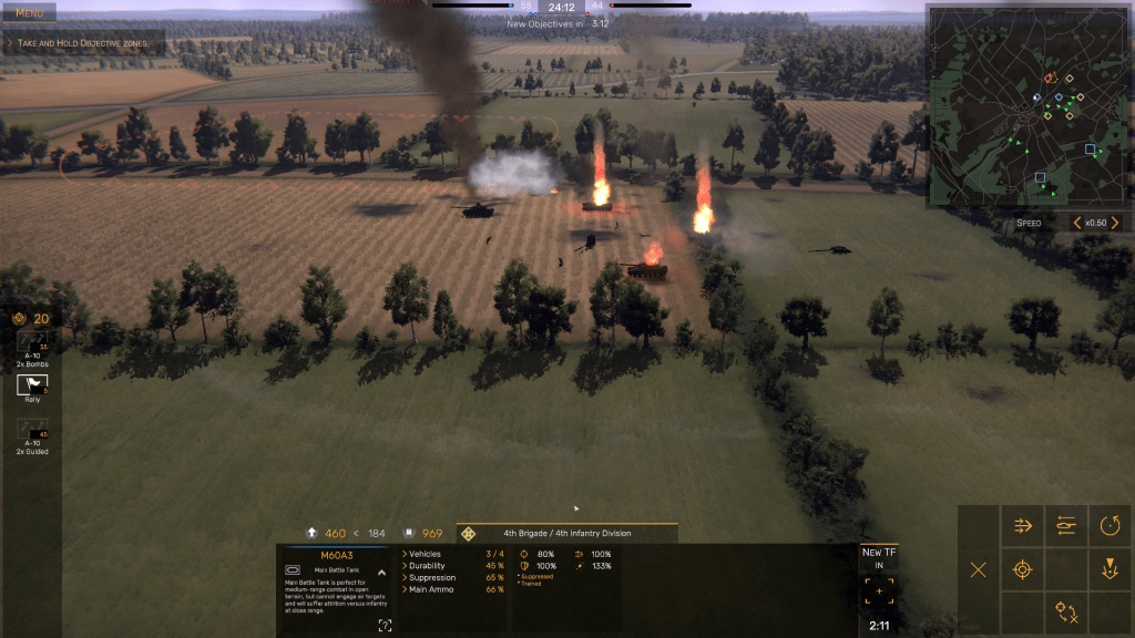In Regiments, which is a real-time tactical level game featuring armored combat in a fictional scenario in which the Warsaw Pact invades West Germany before the events of November 1989, you are in charge of a regiment/brigade-sized unit (which varies in size, type, and available equipment, as not only does Regiments depict units from armies from different countries, but also the division types and their Tables of Organization & Equipment, or TO&E in military jargon) either in the Warsaw Pact or in NATO.