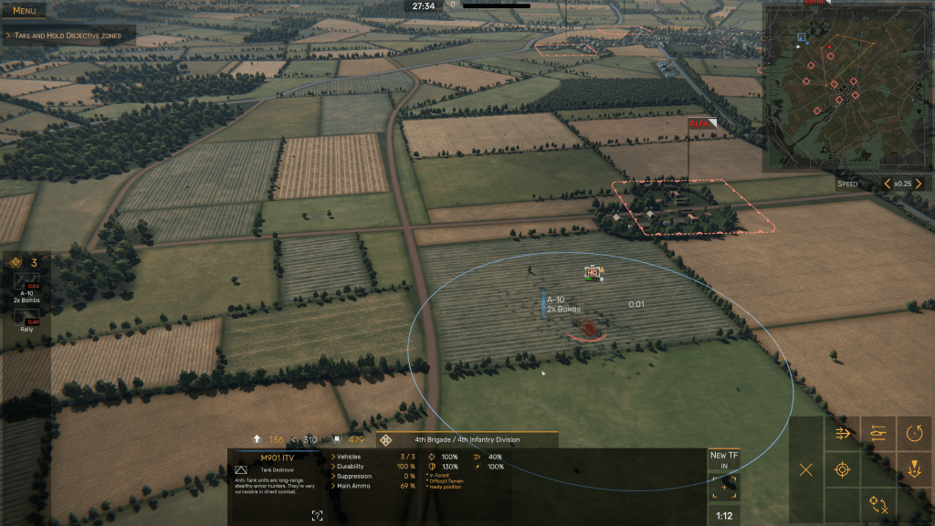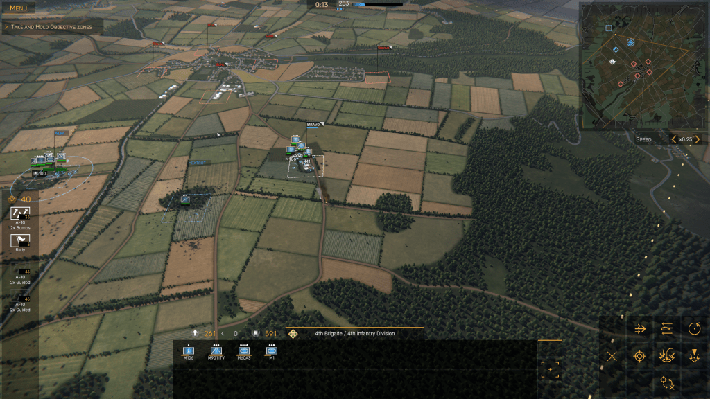 A few hours ago, I fought my first complete Skirmish, an Attack mission in which I was the commander of a U.S. Army brigade from the 4th Infantry Division. This unit was still in the middle of transitioning from older equipment like M60A3 tanks and M113 armored personnel carriers (APCs) to late Cold War stuff like M1 Abrams tanks and M2/M3 Bradley infantry fighting/cavalry fighting vehicles.