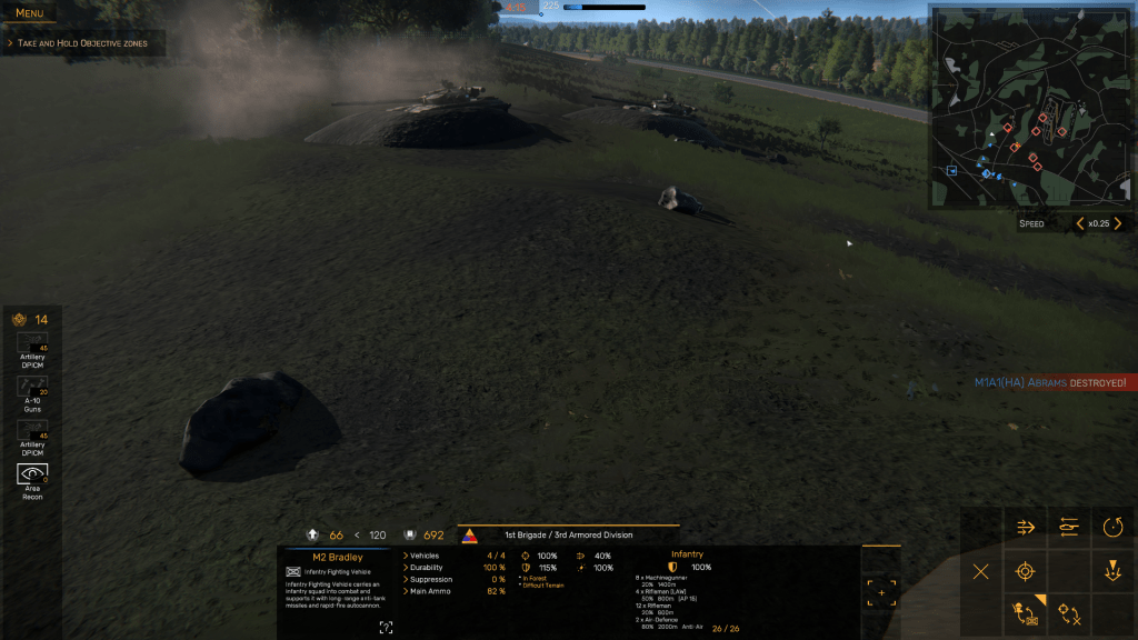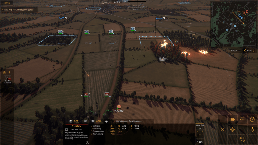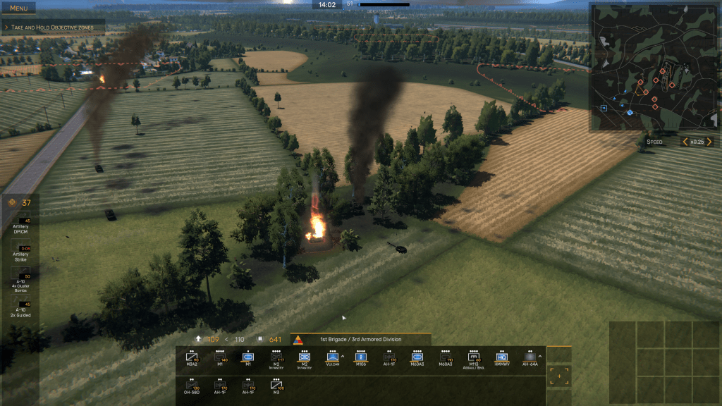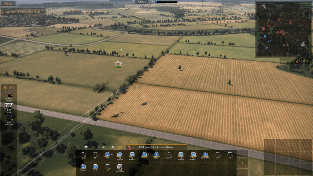 Just as Armored Brigade inherited some of the conventions from other wargames such as the Close Combat series from the late 1990s, Regiments seems to take many of its cues from France’s Eugen Systems’ popular Wargame series – Wargame: European Escalation, Wargame: AirLand Battle, and Wargame: Red Dragon. The basic “look” of the game closely resembles Wargame: AirLand Battle, at least in the broad strokes of zoomable 3-D views of the battlefield, Objective Zones labeled with the NATO phonetic alphabet, and a simple point-and-click user interface (UI) with which you issue orders to your various units.