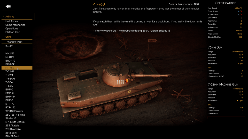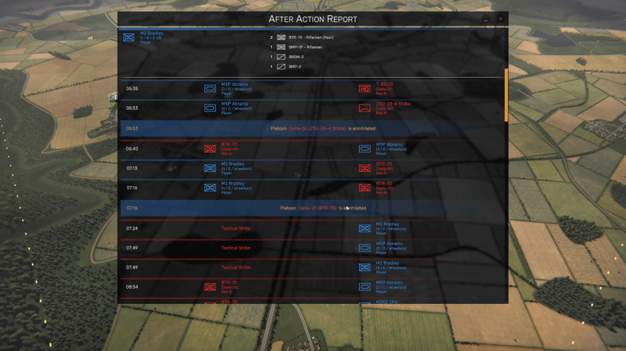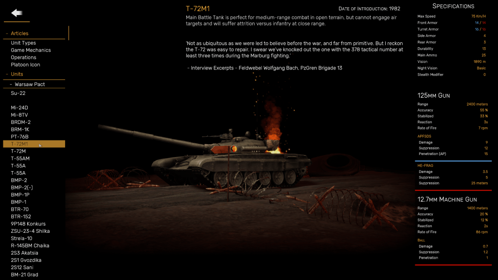 And as in Armored Brigade, Regiments offers commanders a wide range of units and weapons systems that were in service 33 years ago, including various models of American M1 Abrams main battle tanks, West German Marder armored personnel carriers, several marks of West German Leopard main battle tanks, Soviet BMP-1 and BMP-2 infantry fighting vehicles, and British Challenger main battle tanks.