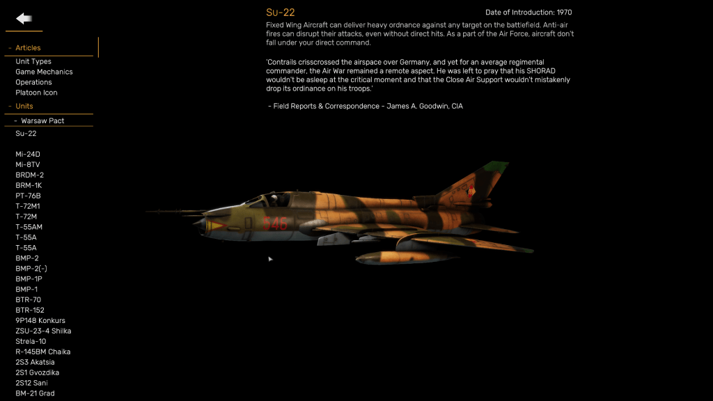 As in any World War III land combat simulation that depicts warfare at the tactical level, Regiments also gives players the opportunity to employ support units tasked with scouting, fire support, air defense, and even simple logistics. There are also combat engineers, helicopters (both scout and attack), and dedicated ground attack aircraft such as the Russian-made Sukhoi Su-22 and the American A-10A Thunderbolt II, aka Warthog.
