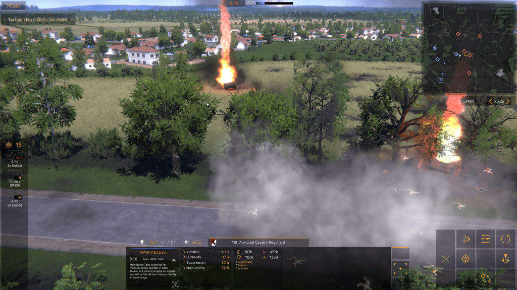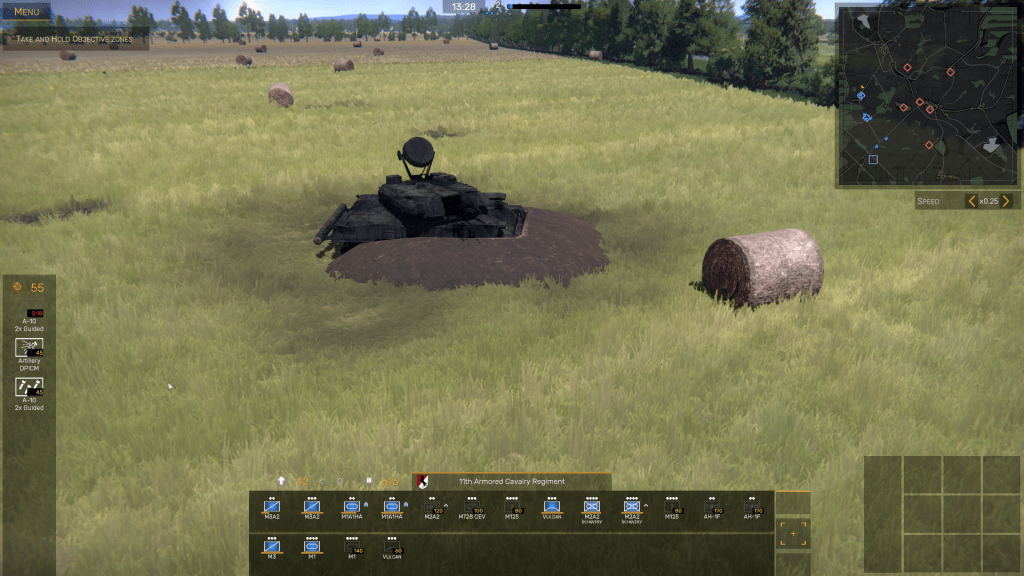 So, okay. During the first 10 minutes of the battle, I focused my attention on capturing Objective Zone Alfa with the forces I assembled with the initial allotment of “deployment points” the game allowed me at the start of the Skirmish. A scout platoon, two Abrams tanks, a platoon of Bradley IFVs with 26 infantrymen, and a three-vehicle platoon of mobile Vulcan anti-aircraft guns.