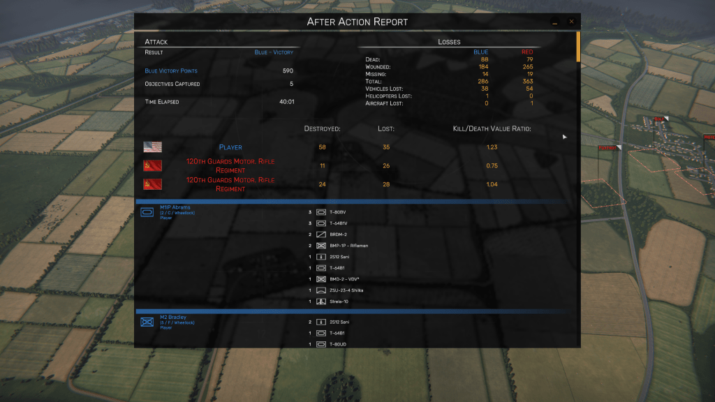 I did, of course, suffer casualties. I lost a few more men killed in action (88 U.S. KIA to 79 Soviet KIA) than the 120th MRR, but my Kill/Death Value ratio was better than the enemy’s, and Russian casualties – mainly wounded in action – were higher than those of the 1st Brigade/3rd Armored Division.