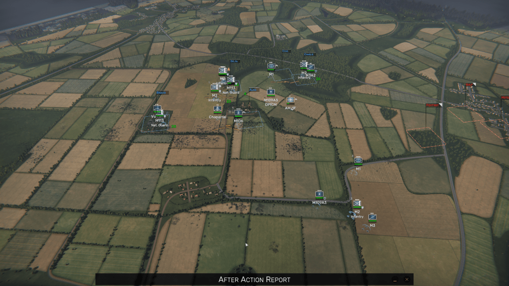 Apparently, Regiments has one Warsaw Pact unit – the 120th Guards Motor Rifle Regiment – as the fixed opposing force (OPFOR) in the Grasleben Skirmish, and because it’s listed twice in the After-Action Report, I assume it’s because I faced two battalions of the 120th Guards MRR.