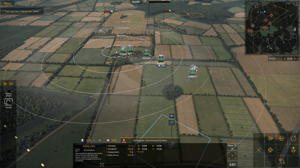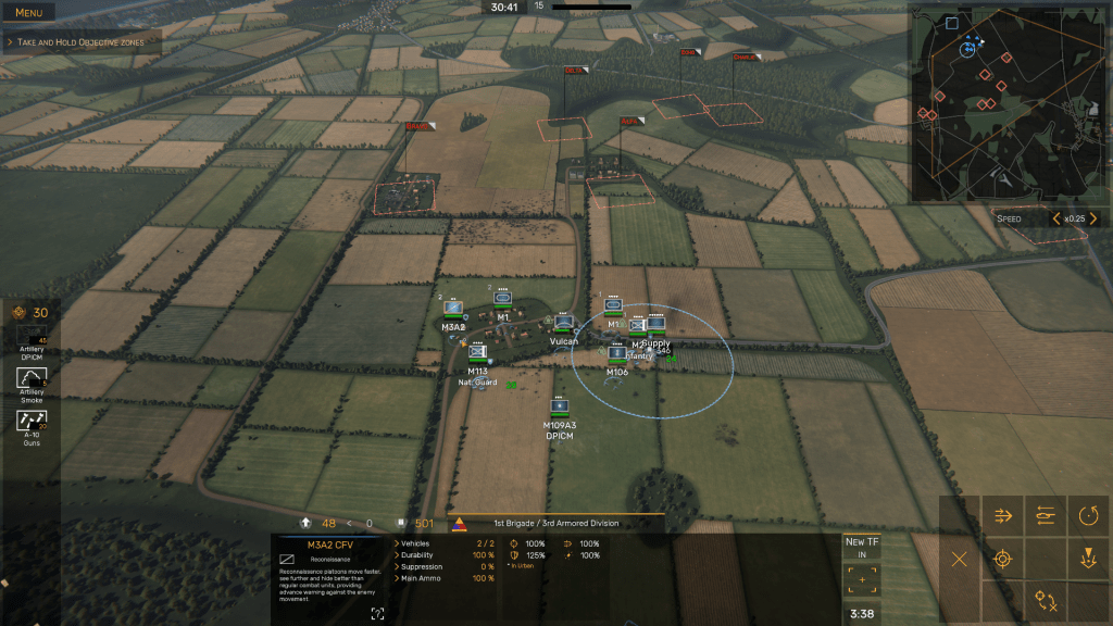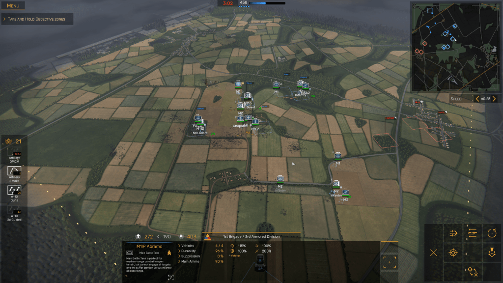 One thing that helped, I think, is that I was able to change the Skirmish time limit from 30 minutes to 40. Last time I played Regiments with the 30-minute limit I tried to make too many decisions regarding whether to advance on an OZ or stand pat on the ones I already occupied. I opted to advance into what seemed like an undefended zone, only to lose half a platoon – two vehicles – of M1 Abrams main battle tanks and an entire platoon of Bradley M2 Infantry Fighting Vehicle with 26 infantrymen to a well-laid ambush by Soviet T-80 tanks and BMP-2 IFVs. I used A-10s to destroy those pesky Soviets and sent another two-platoon force to capture the objective, but the losses from the earlier attempt counted against me when the game sorted out who won and who lost.
