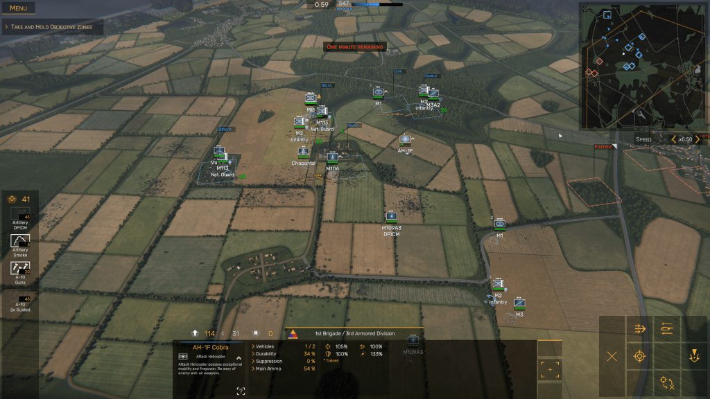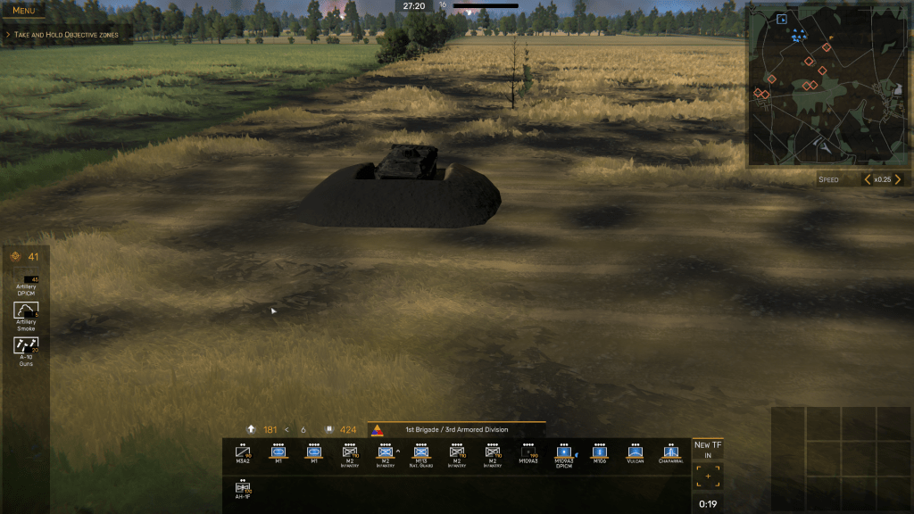 Suffice it to say, Dear Reader, that I’ve figured out a way to nibble away at the Soviet defenses with the small number of American units while I assemble a battalion-sized force and start capturing Objective Zones (OZs) one by one. (The most ambitious operation I can attempt is to go for two OZs at the same time, but for that, I need to have enough Deployment Points to create two balanced combined arms teams and provide enough artillery and air support to assist them both.)