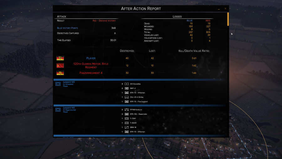 After that first Attack mission, the game’s artificial intelligence (AI) commander denied me even minor wins for about three days. Oh, I always grabbed three or four enemy OZs and inflicted heavy casualties on the Warsaw Pact with my NATO units, but because of Regiments’ exacting scoring system that measures not just the number of men, vehicles, and aircraft lost, but also the Kill/Death Value Ratio (or Kill Death Ratio in similar wargames, such as Combat Arms).