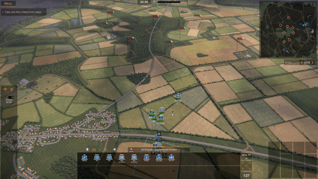 Not only have I learned to tweak the settings so a Skirmish (the Regiments term for a single engagement) to extend a scenario’s time limit and speed up the deployment process of Task Forces a bit, but I’ve acquired more practical knowledge about modern land combat, as well as refining some of the savvy I’ve acquired when playing similar games, including Armored Brigade, Wargame: AirLand Battle, and even the original MicroProse’s 1989 M1 Tank Platoon.[1]