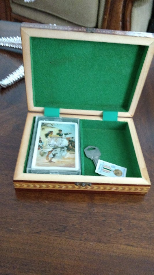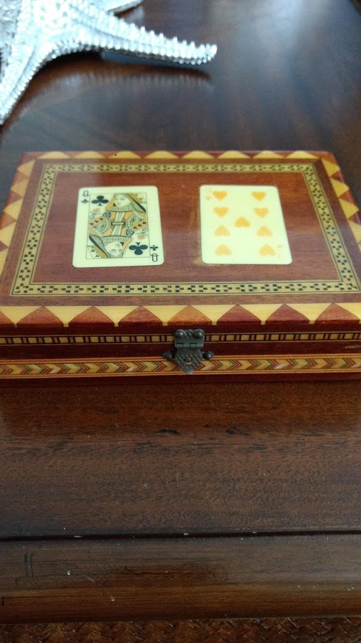 The deck of cards and the keepsake box I bought in Sevilla for Mom (Mami) in late November 1988. For 27 years, she kept that box on top of a table in our living room, where everyone could see it. The artwork on the lid is faded because the afternoon sun flooded the living room through the big west-facing sliding glass doors.