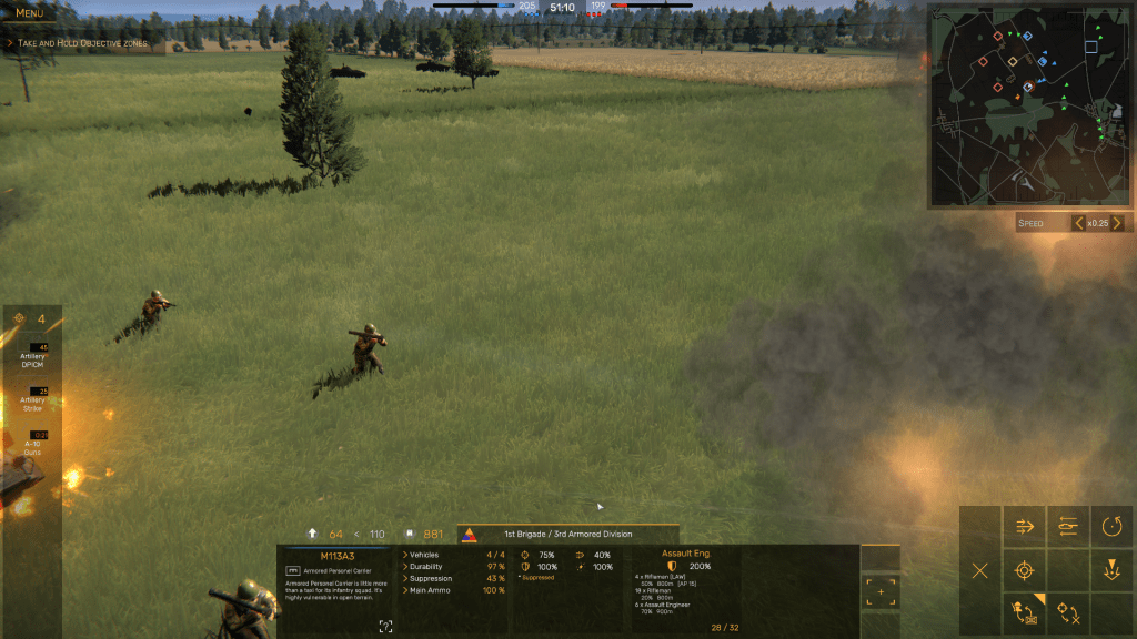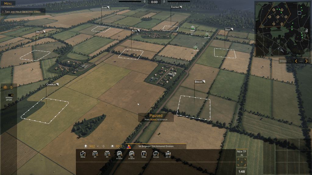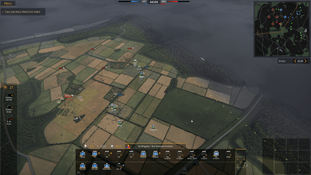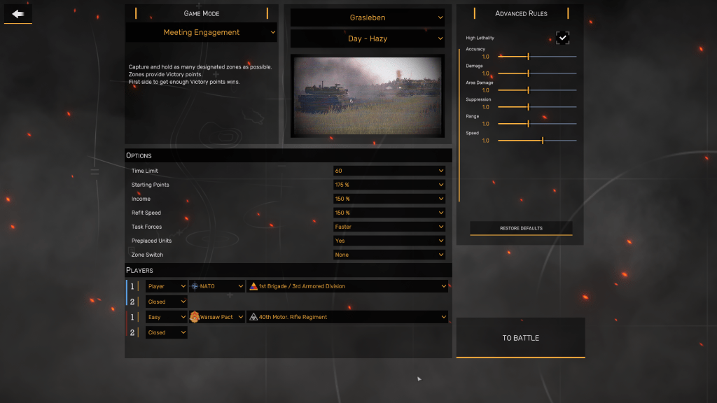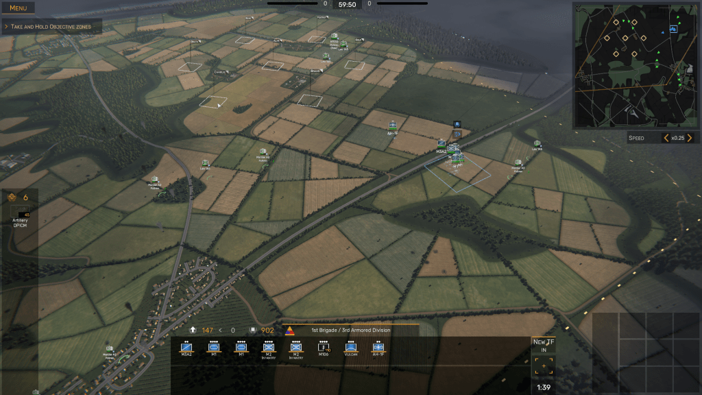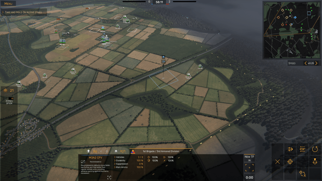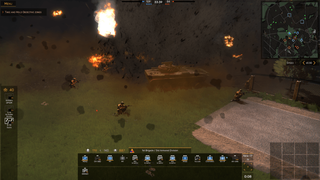 In Regiments, the idea is to occupy as many Objective Zones (OZs) as possible without spreading your forces too thinly, inflict as many casualties on the artificial intelligence (AI) controlled side as you can, then capture and hold territory until the mission time – which can be set to either 20, 30, 40, or 60 minutes – elapses. The side that scores 1000 points first is then declared the winner.