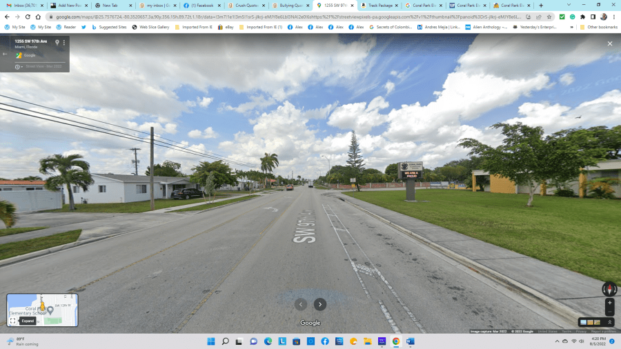 Southwest (SW) 97th Avenue, looking north. Coral Park Elementary can be seen to the right. In 1972, I lived five blocks to the west of the school. Image Credit: Google Maps on “street view.”