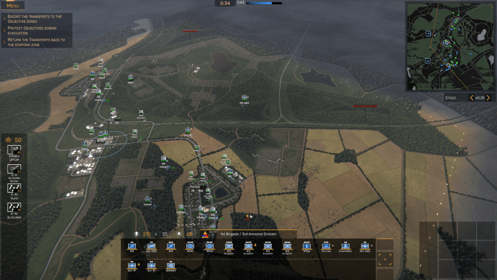Today I chose to try the Mobile Defense variant in Skirmish mode. Here, you have to hold a defensive position – comprised of three fortified outposts occupied by allied forces under the computer’s control – while transport units evacuate personnel – presumably wounded troops – to two “starting areas” on the battlefield map. As a commander in this type of mission, you must protect the transport units carrying out the evac while fighting off enemy forces that are advancing against you from different avenues of approach.