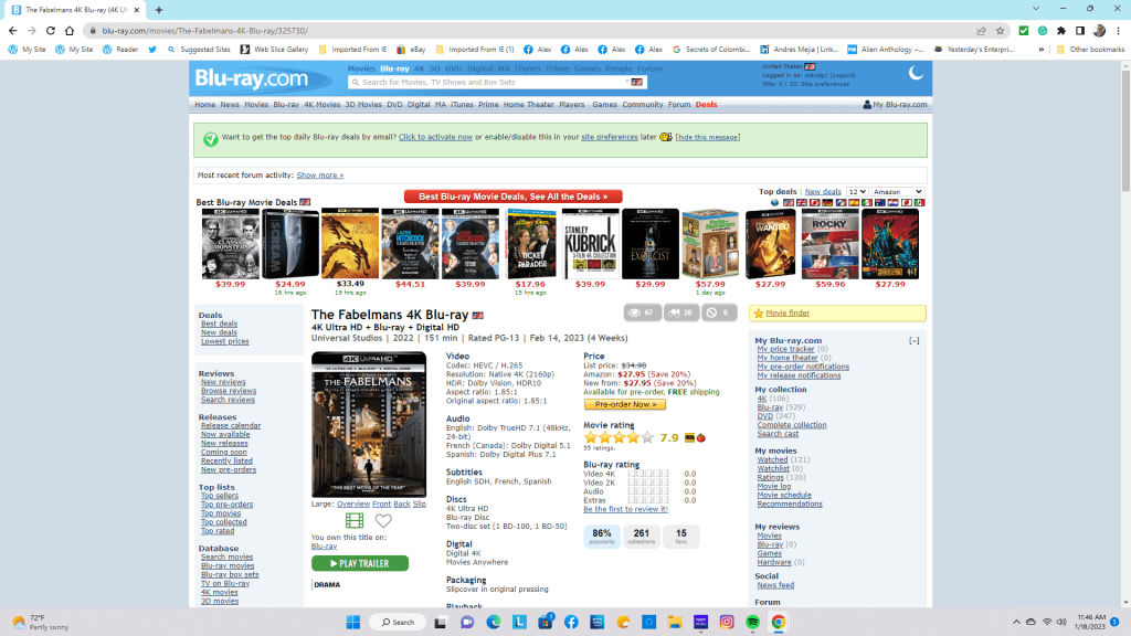So unless I change my mind and decide to order Young Sherlock Holmes by paying for most of my order with Amazon Shop With Points, The Fabelmans will be the next addition to my growing collection of 4K UHD titles (106 owned or ordered) and 527 BDs.