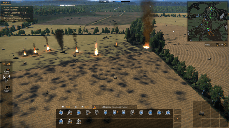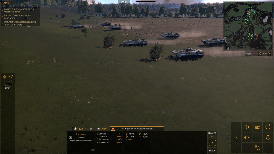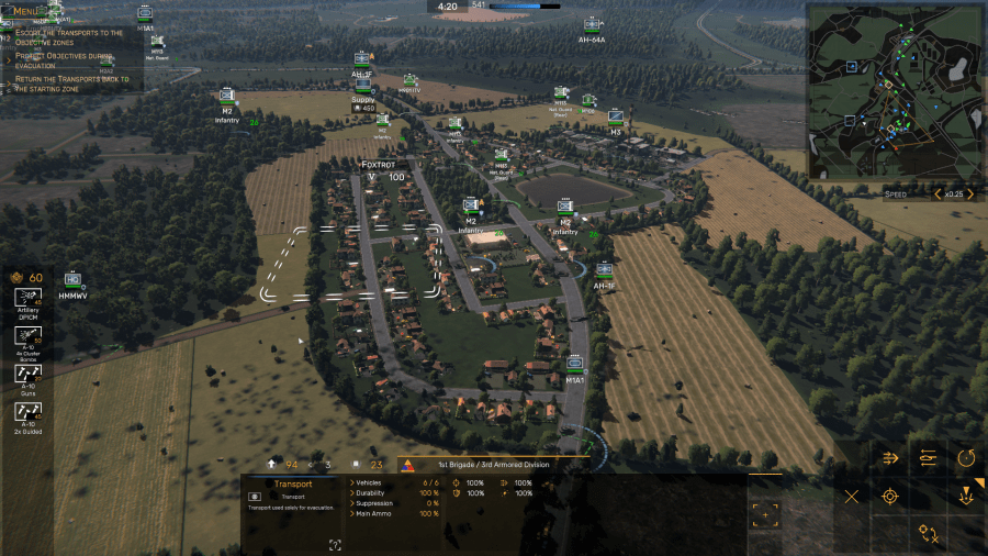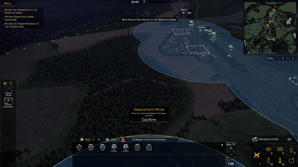 Although there are eight Objective Zones (OZs) on the map, labeled Alfa through Hotel, in Mobile Defense mode you only see two at one time. The game chooses which OZs you must send your Transport units to at random, so sometimes the first evacuation moves will be easy to carry out because they’ll be close to the Starting Zone, while at other times you will have to send the Transports to OZs further away from the Blue Force start zone – and closer to the enemy’s axis of advance.