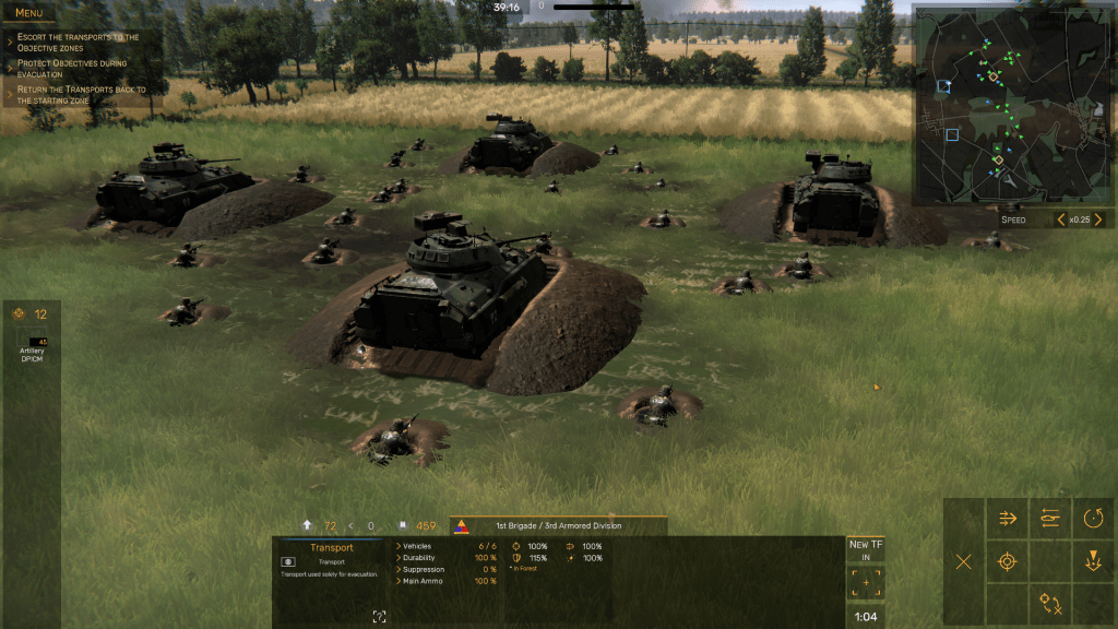 In Mobile Defense, you command your basic mix of task forces (the core one you get at the start of the game, plus three additional task forces you can request from Brigade HQ), a Supply unit, and two Transport units that are only available for this type of mission. Your mission as a commander is threefold: