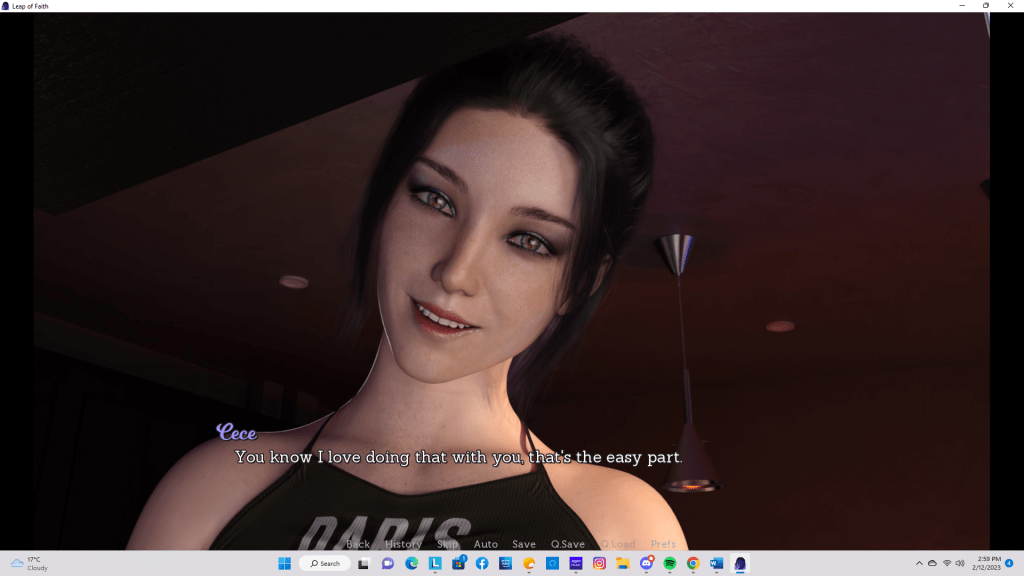 The art in my favorite ones so far – Acting Lessons by Dr. PinkCake and Leap of Faith by DriftyGames – is absolutely stunning; the 3D renderings of the characters (especially the women) in Leap of Faith struck me as particularly noteworthy. Obviously, the NSFW sex scenes are riveting (the animation work in them is the best I’ve seen so far), but overall, the art (especially the clothing, locations, and environment) is impressive.