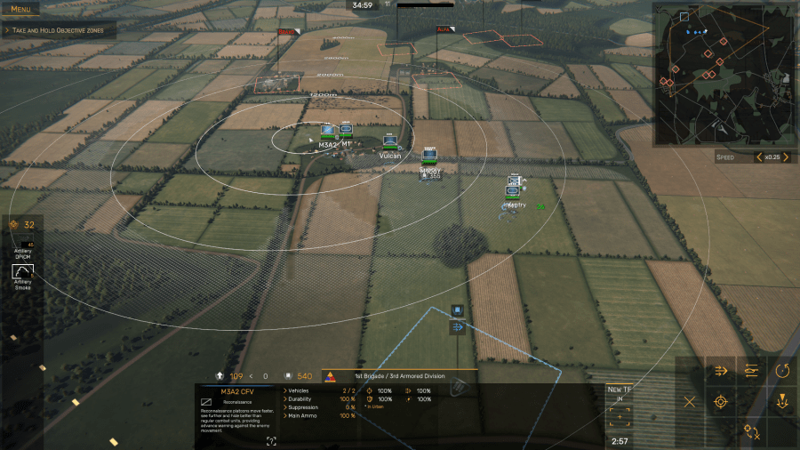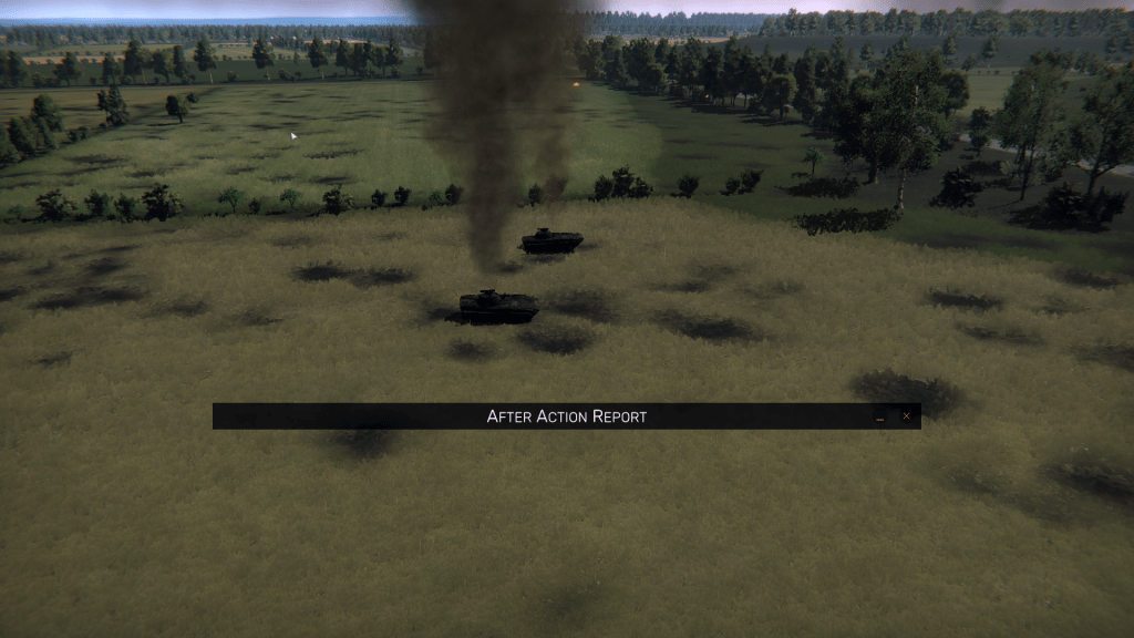 Alas, no. The enemy still had some reconnaissance platoons and one platoon with T-64 main battle tanks, so while I was focused on capturing OZs Golf and Hotel, the Soviets found my flanks wide open and captured OZ Bravo, destroying two anti-aircraft units and decimating one of my two M3 Cavalry Fighting Vehicle sections before I was able to send a few platoons of tanks and M2 Bradley Infantry Fighting Vehicles to retake Bravo and destroy the remnants of the Pact forces.