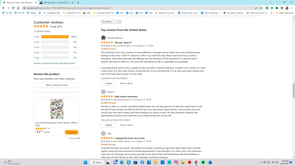 This is one of the reasons why I needed to fix all the issues in Reunion: A Story. It might not be the best story ever written, but it is a good story – I can show you 10 reviews that say just that – and I worked long and hard to make sure it is entertaining and emotionally involving, My hope – naïve as it might be – is that enough people, starting with my friends and acquaintances, will buy Reunion, read it, then recommend it to other people, who will then read it and recommend it to even more people.