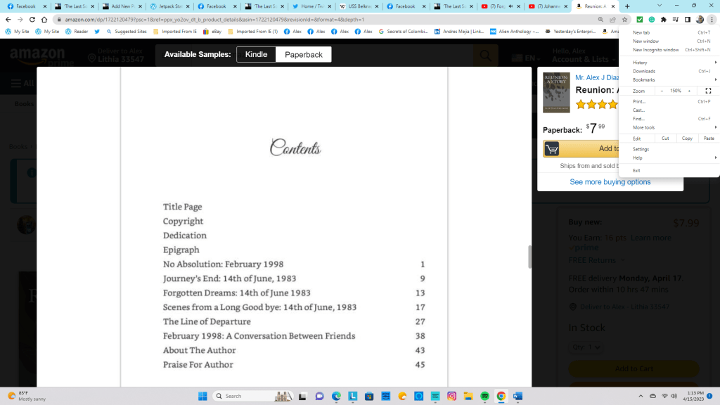 The dream sequence is the cornerstone of Reunion. It’s a revision of an old assignment from a college creative writing class I took 36 years ago. Describing the band as a Fifties rock group was a valid choice. But after reading some rewrites of Reunion by Bing Chatbot AI and considering Jim’s fascination with World War II and 1940s pop culture, I decided to change the band’s genre to swing. I made the change a little over two hours ago, and Amazon says the new version of the text will be visible on the Kindle e-book edition between later this afternoon and Wednesday morning.
