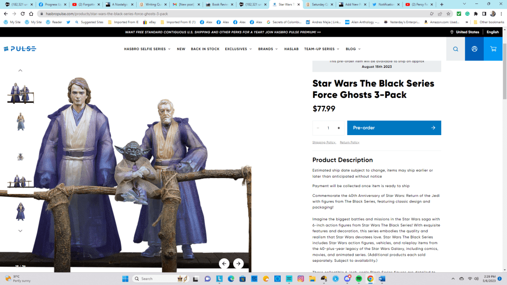 I did succumb to temptation this morning and pre-ordered a pricey Star Wars The Black Series collectible from Hasbro Pulse: a three-figure set of 6-inch scale action figures of Anakin Skywalker, Yoda, and Ben (Obi-Wan) Kenobi as they appear in the “Force Ghosts” scene of Return of the Jedi (as reimagined by George Lucas for the 2004 reissue of the Star Wars Trilogy on DVD and its subsequent Blu-ray releases from 2011 onward.