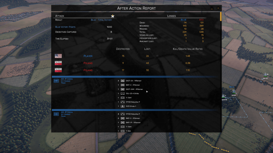 I will say, though, that even considering that I woke up super early and that I was exhausted, I did well in Regiments. I did lose 25 vehicles and 74 troops were killed,145 were wounded, and 10 were missing, plus the Poles managed to ambush several of my task forces during the battle. However, I inflicted more casualties on the enemy force than it did me, and I managed to capture all eight OZs before time ran out on the game’s clock.