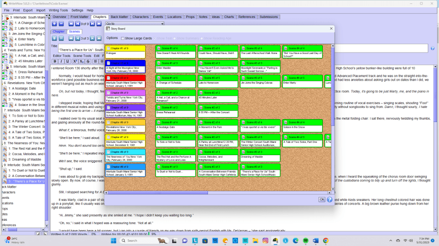- Rewrite the “Somewhere” scene to omit the lyrics in case the fee Concord Music charges is too expensive. If I was certain that Reunion: Coda would sell several thousand copies (especially in the paperback edition), I’d go ahead and keep the version I have now and somehow pay the fee. Based on my experience with Reunion, though, I doubt that I’ll sell enough copies to compensate me for shelling out X dollars for the right to quote a verse from a song