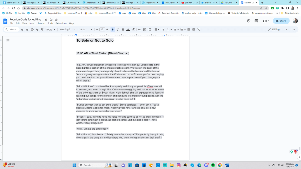 Anyway, about that bit of editing I did earlier: I didn’t do a major revision like the one I did yesterday for the South Miami Senior High set scene in which Jim resists the idea of singing a solo at the 1981 Winter Concert. That one involved quite a bit of rethinking and rewriting, and it took me a few hours to do – I don’t always get things to “sound right” the first time I write something, especially if the dialogue is involved, so I had to first try one version of the scene, then another, then another, until I was satisfied that the new version matched the rest of the chapter, which (thankfully) did not require edits, large or small.