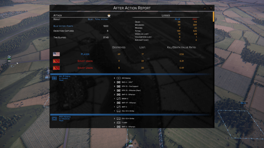 I had to try the Runway scenario several times during the afternoon; I was making too many mistakes at the start of the skirmish and, as a result, taking heavier-than-expected casualties in attempts to capture OZ Alfa – the first enemy position my unit (the 1st Brigade, 3rd Armored Division) must capture before advancing on the air base itself. Even though I know it’s just a game, and even though I’m aware that losing vehicles and soldiers is a reality every combat commander must deal with, I hate it when I start a Skirmish (especially the Attack variety, which usually gives the defense an advantage in the beginning) and I lose one or two platoons to enemy antitank guided missiles (ATGMs) or accurate fire from hidden tanks shooting from carefully sited and camouflaged defensive positions.